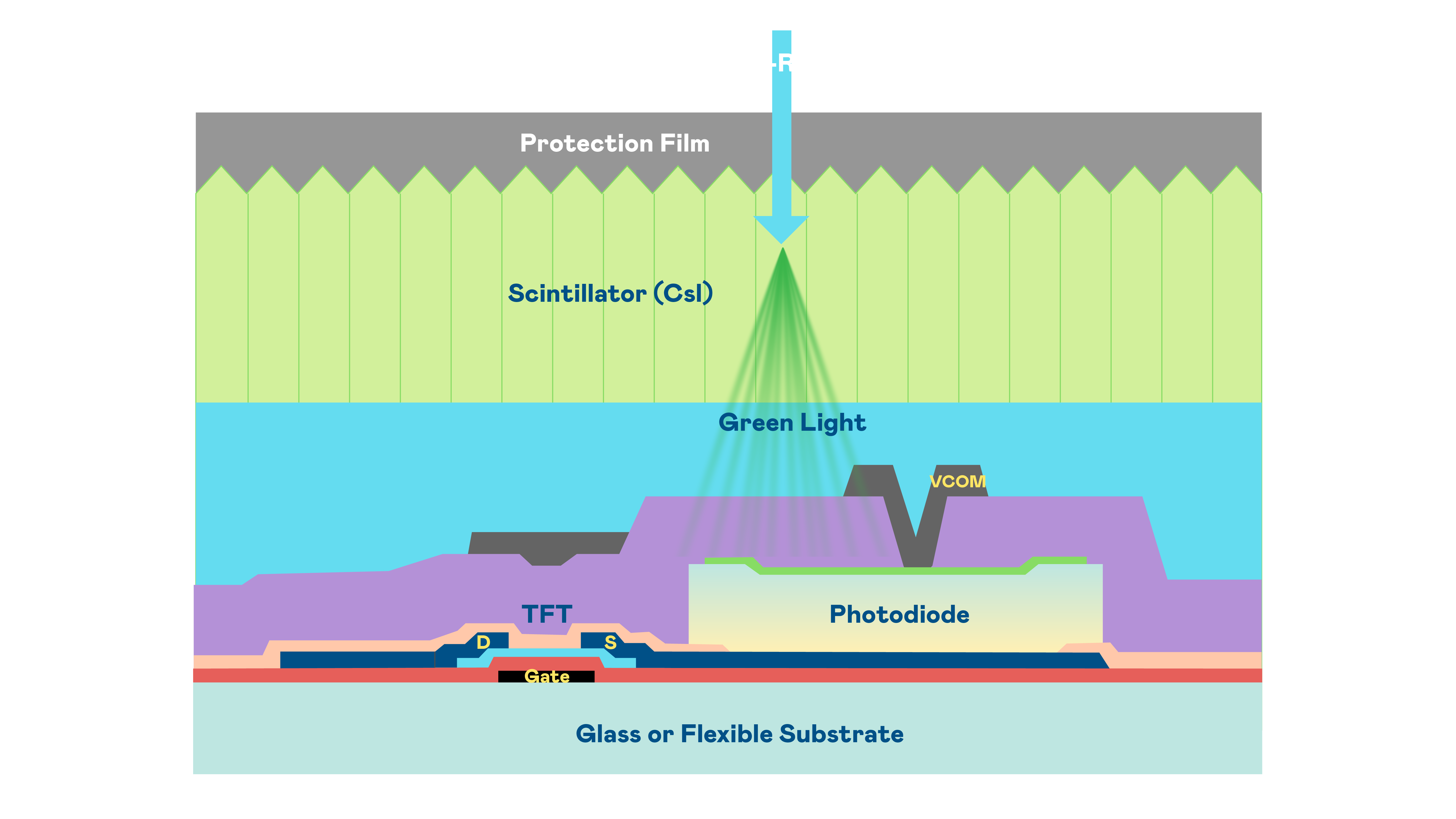 凯发k8官方网站登录的X光影像感测阵列使用薄膜电晶体 (TFT) 作为每个像素的读取开关,搭配光电二极体(Photodiode)的光电转换元件,用以感测X光影像讯号。